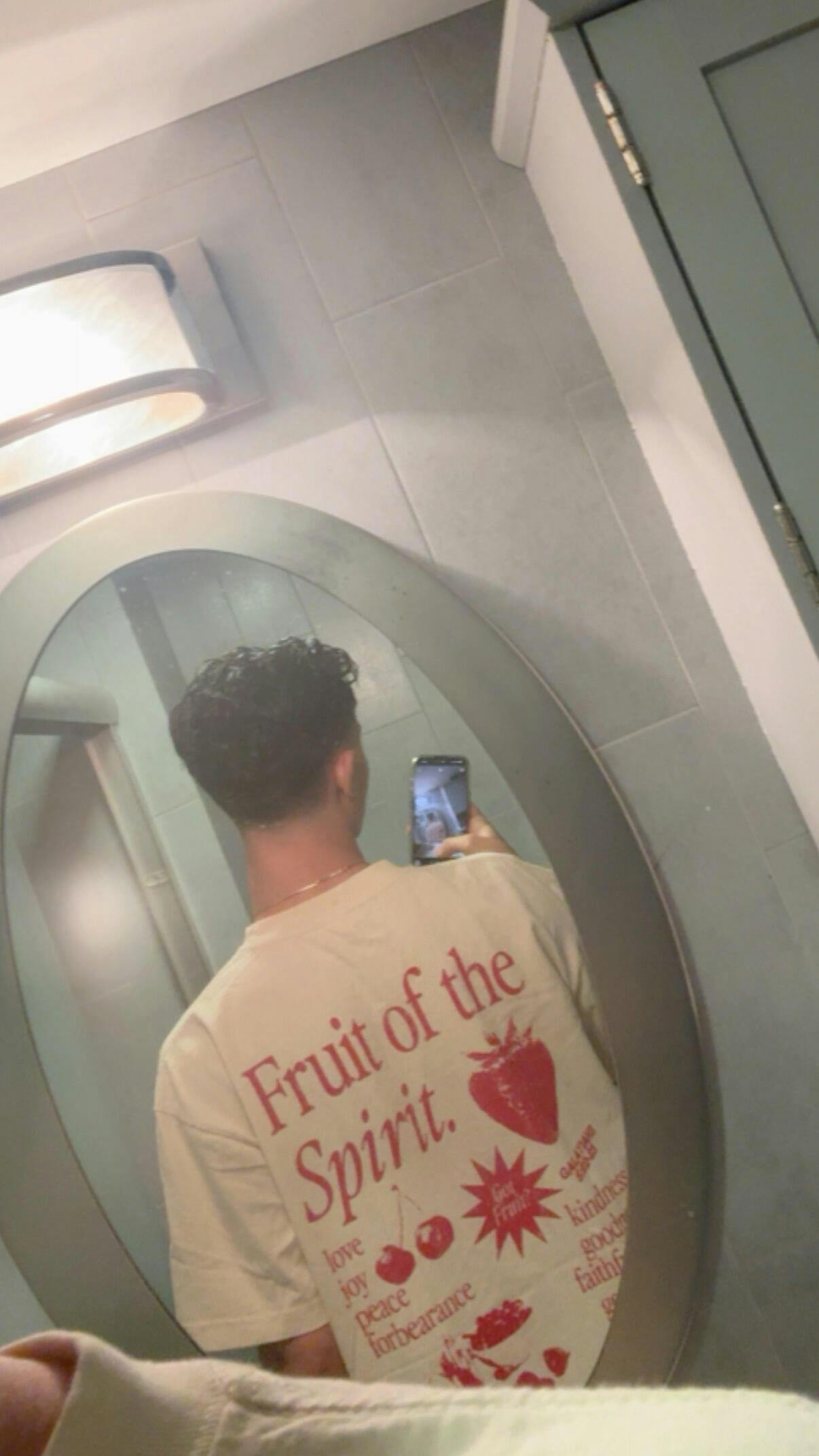 A vibrant tribute to the Fruits of the Spirit. Bold red lettering listes each fruit—love, joy, peace, forbearance, kindness, goodness, faithfulness, gentleness, and self-control. Playful strawberries and bananas add a touch embodying the abundance that comes from walking in the Spirit. Embrace the essence of Galatians 5:22-23 and wear your faith proudly.