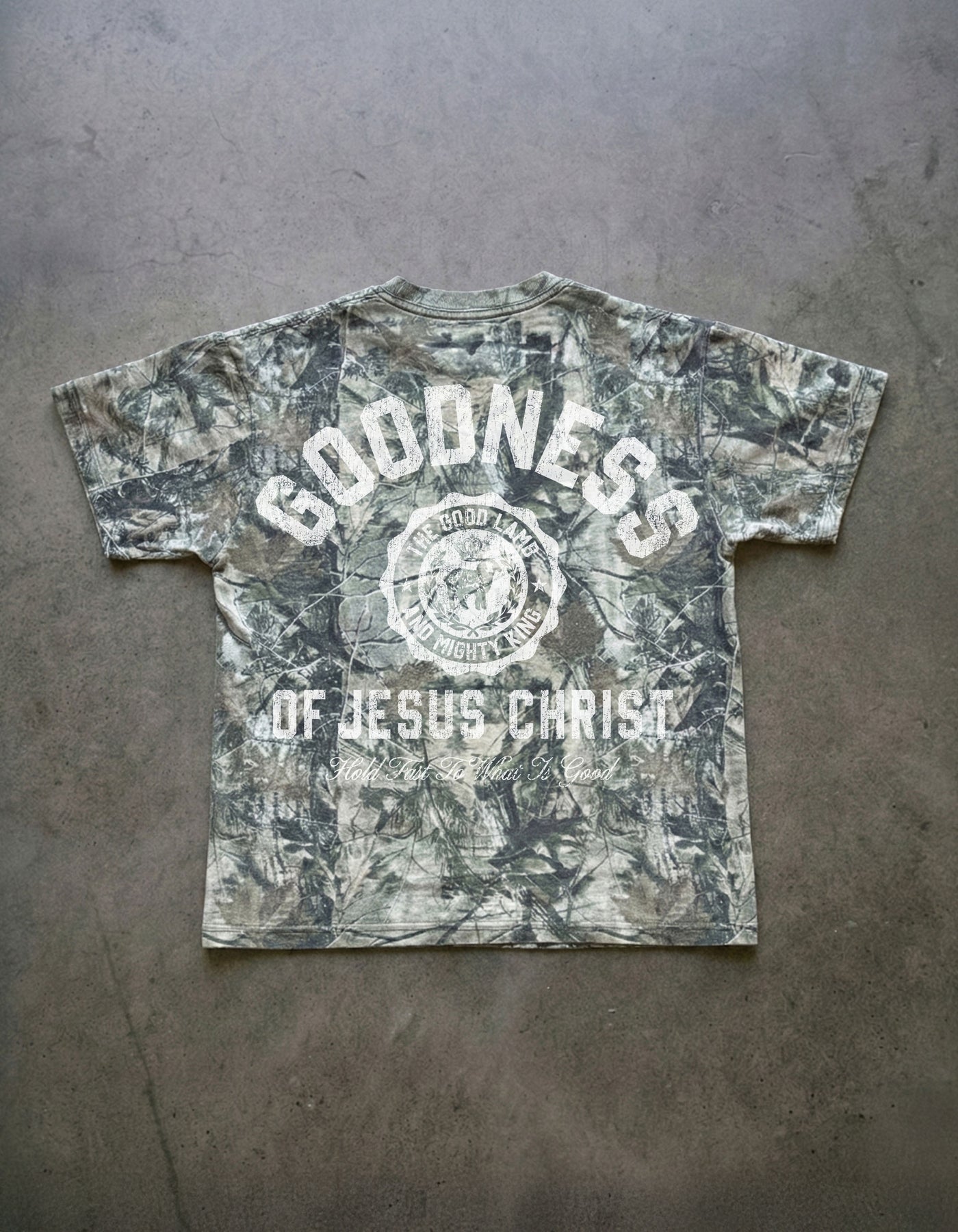 "Goodness of Jesus Christ" camo tee is a testament to faith and grace. Inspired by the profound message of holding fast to what is good, this shirt embodies strength and devotion. The back features a crowned lamb, symbolizing Jesus Christ the Good Lamb and Mighty King. Just below, in small yet powerful text, the reminder to "hold fast to what is good" (Romans 12:9)